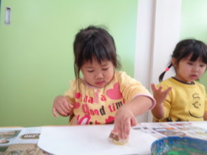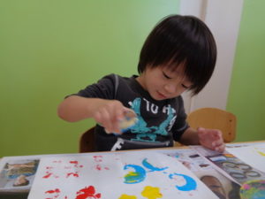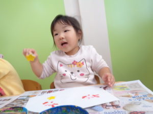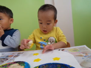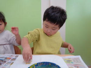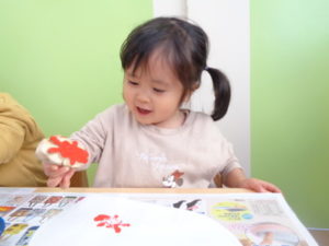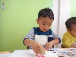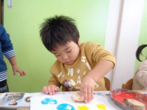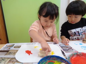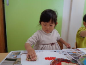 沢山動いた後は、自分達で掘ったさつまいもで作ったスタンプをしました。