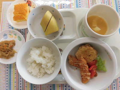 今日の給食はししゃもフライでした。頭から食べれるのでカルシウム満点♪