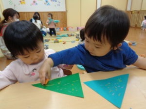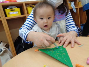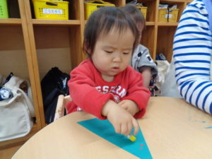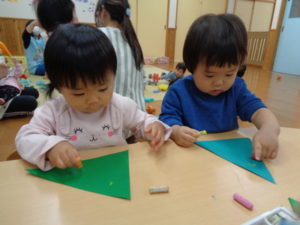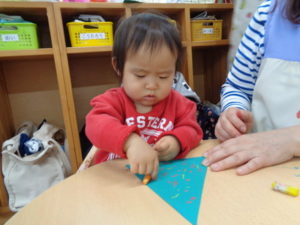 今日は、ツリー型の色画用紙にクレヨンでぬりぬり。模様を描きました。