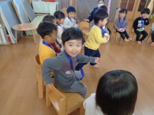 椅子に早く座るというゲームですが、なかなかルールの理解が難しかったようです。