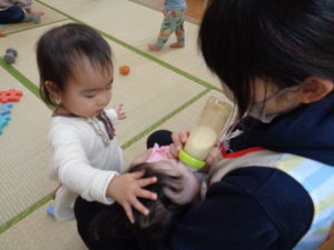 ミルク🍼を飲んでいるお友達を”よしよし”している姿も見られましたよ!