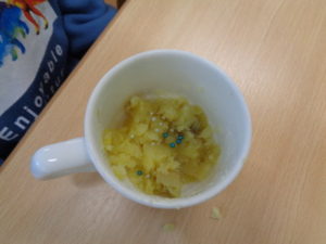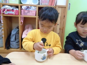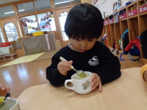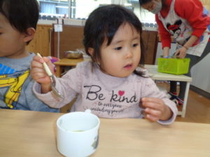自分達で掘ったサツマイモ🍠をスプーンで上手につぶし、アザランをかけて食べました。