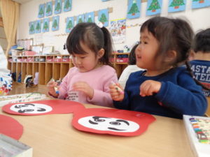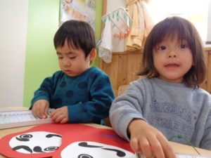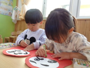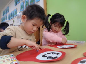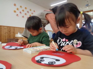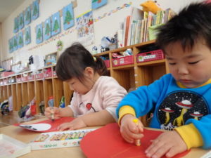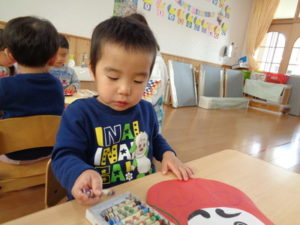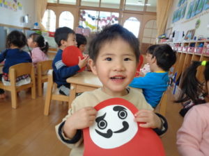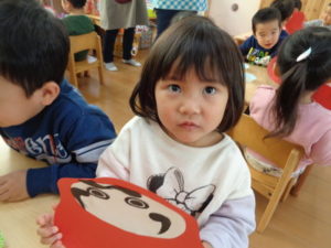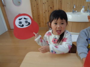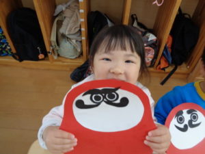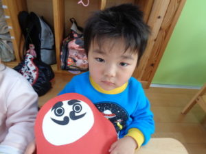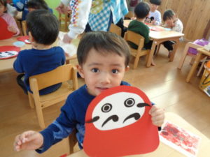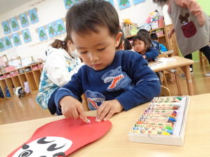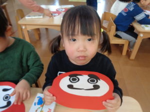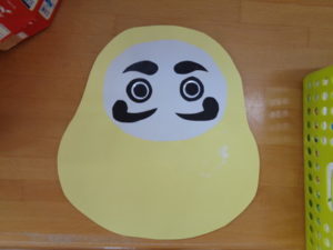 お手本をしっかり見ながら、「どこに付けようかな?」と友達とお話しながら、だるまの顔をのりで上手に付けていました。