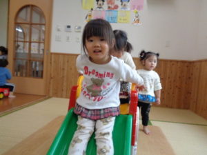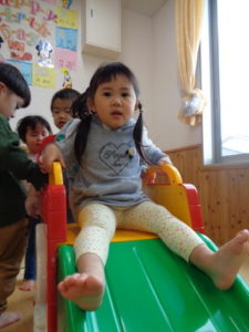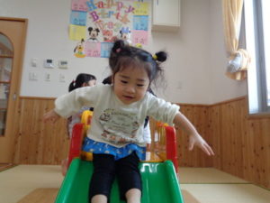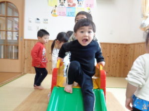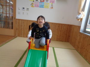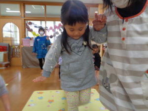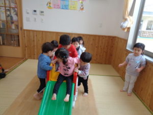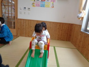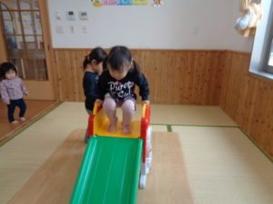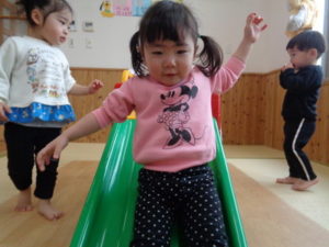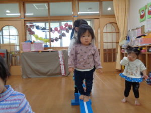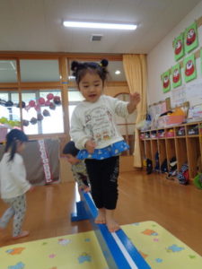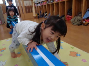うさぎ組🐇の部屋では「平均台と鉄棒」、りす組🐿の部屋では「コンビカーと滑り台」を置き、自由に行き来していました。