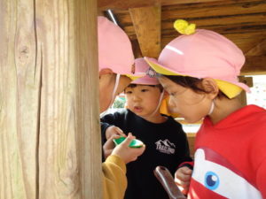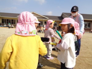 保育者のお手本を見て、子ども達はバトンを「渡す・走る・もらう・渡す・・・」と何度も繰り返しつぶやいていました。