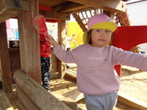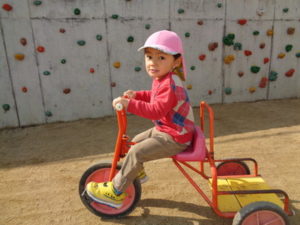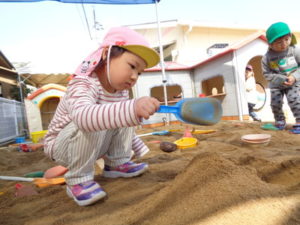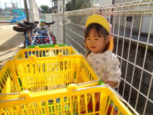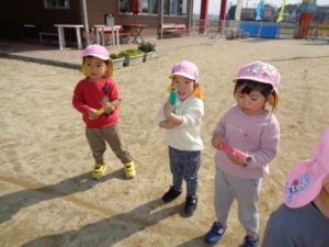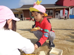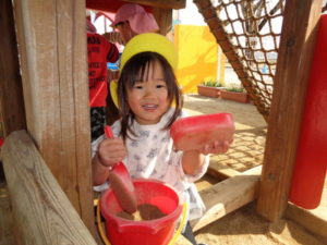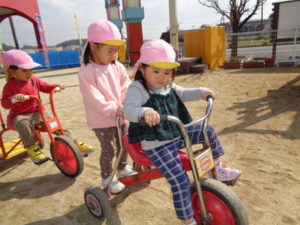 シェフになりきって料理をする子、三輪車をこいで遊ぶ子、泥だんご作りをする子などがいて、それぞれ自分が好きな遊びを見つけて楽しんでいました。