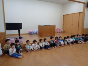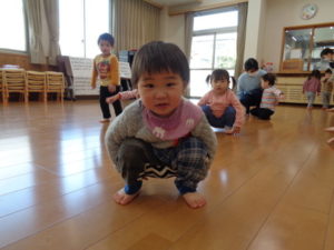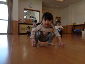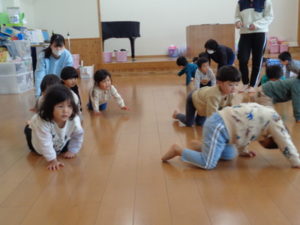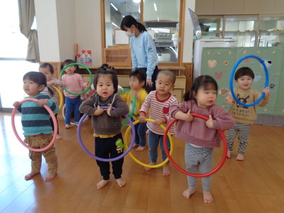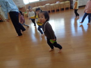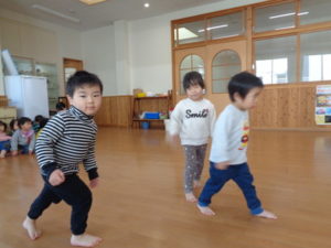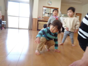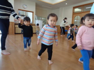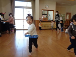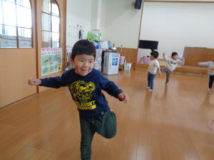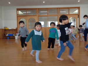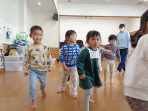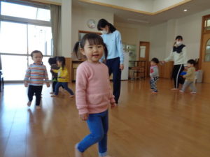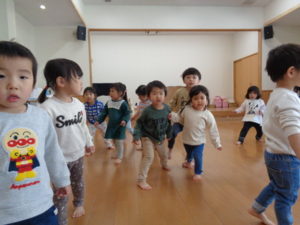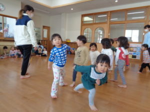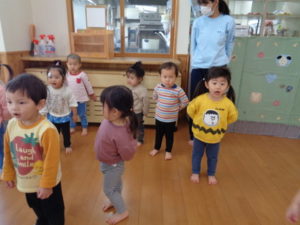 今日は、うさぎ組🐇さんや実習生と一緒に、ランチルームで沢山身体を動かしてリトミック遊びを楽しみました。