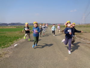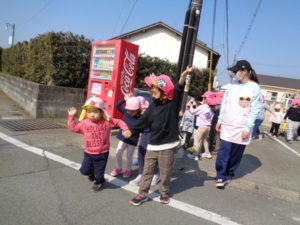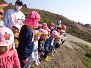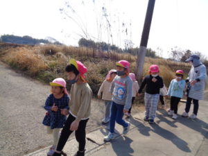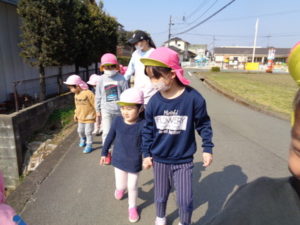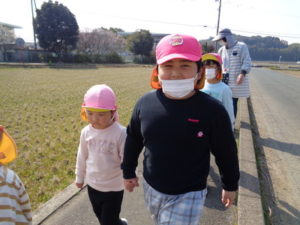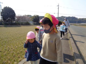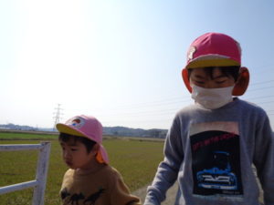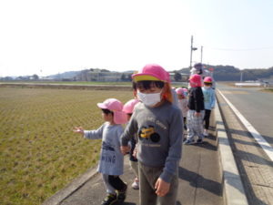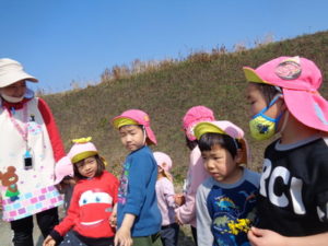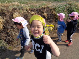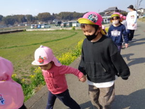 歩いていると・・・うさぎ組🐇のお友達が「あ!黄色いお花🌼!」と言うと、「菜の花っていうんだよ🎶」と教えてあげるきりん組さん🦒でした。
