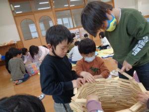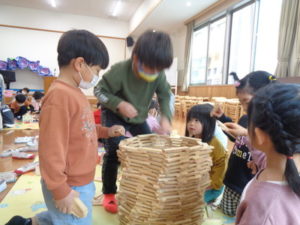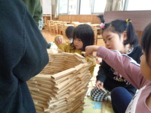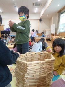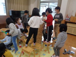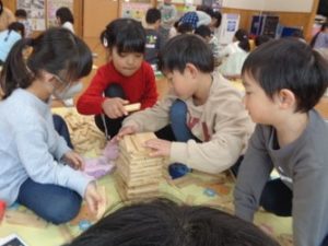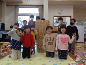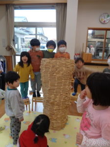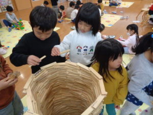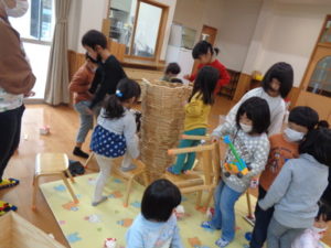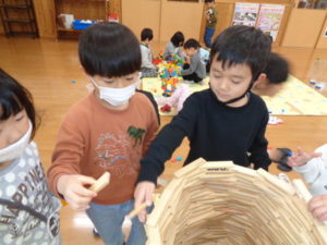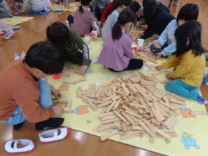 カプラのコーナーでは、みんなで協力して高く積み上げたり、ジェンガの様にして遊ぶ子ども達。