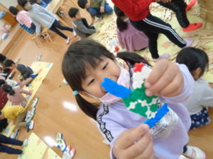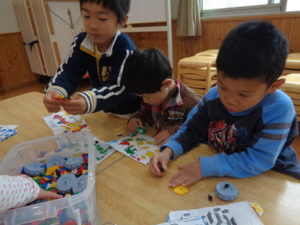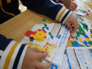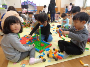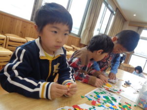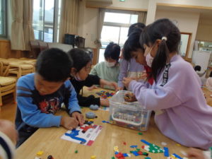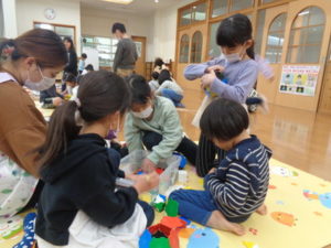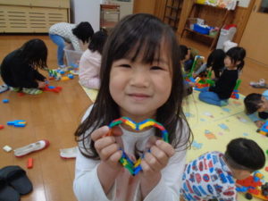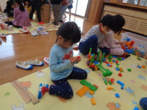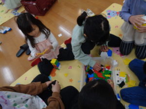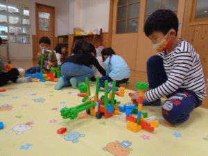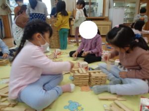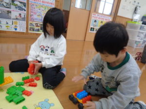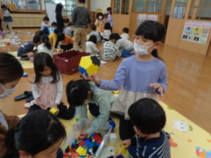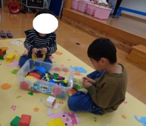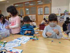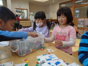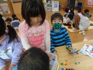 ラキューブロックのコーナーでは、お手本を見ながら、同じ形のブロックを見つけて椅子に座り真剣な子ども達。