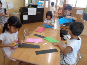 終わった子は、ハサミ✂で線の上を切る作業をしました。