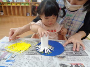 今日は、誕生会の催し物に向けて、お集まりをした後、トイレットペーパーの芯を花火に見立てて、スタンプ遊びを楽しみました。
