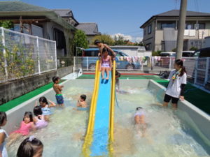 滑り台にホースをはめて水を出すと、大喜びする子ども達💖