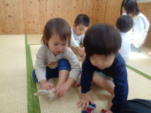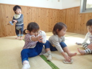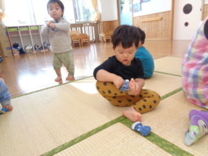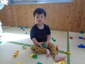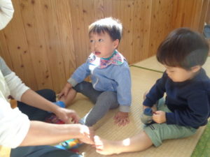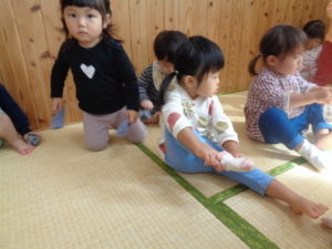 今日は、ブロック遊びをした後に、靴下を履く練習をしました。