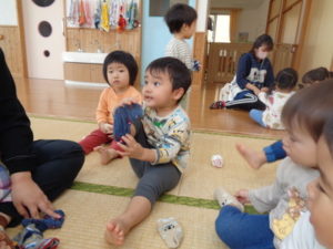 靴下を手に取り自分で履こうと靴下に足を入れて引っ張る姿が見られました。