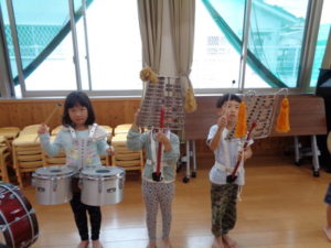 今日は、ランチルームと保育室に分かれて、マーチングの練習をしました。