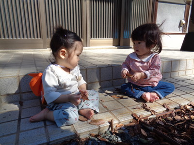 降りて遊んでみると、砂利や落ち葉遊び、探索を楽しみました。