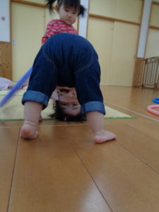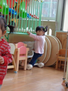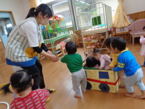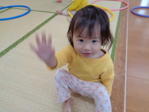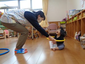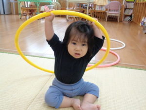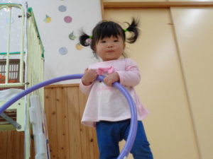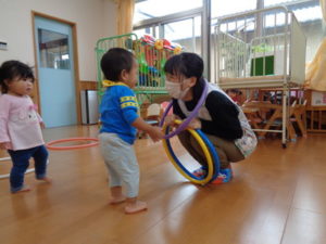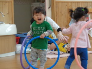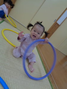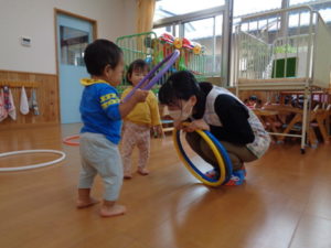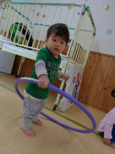 小さな輪と、大きな輪を両手に持って歩く子、保育士に「捕まえた❣❣」と言われて、嬉しそうにする子など思い思いに楽しんでくれていました😆