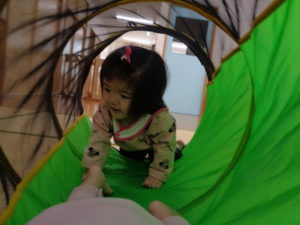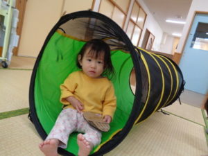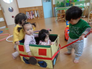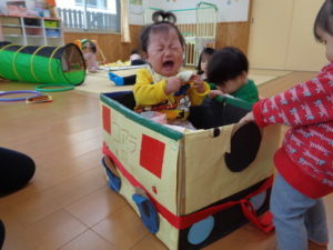 またトンネルくぐりも楽しんだり、以前西小学校の子ども達から頂いた手作りの車に乗って楽しみました🎶
