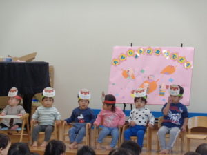 次にパネルシアターで「猫のお医者さん」があり、一緒に歌ったり「ニャー🐈」と気合を入れたりして、動物さんたちの病気を治してくれました。