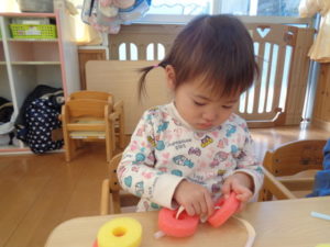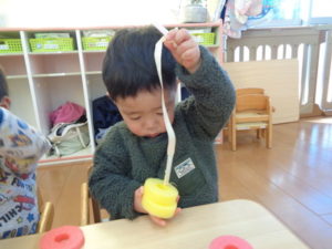りんごの型と、リングを真剣な顔をして、一生懸命に通して、