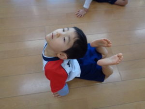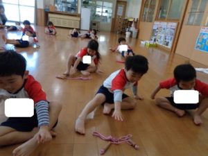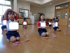 縄から落ちない様にバランスを取りながら歩いたり、縄を踏まない様に両足跳びをしたり・・・。