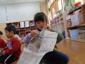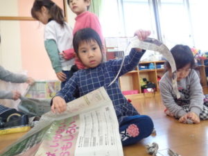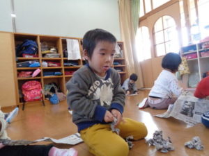 明日は、豆まきがあるので、新聞紙📰を使って豆をたくさん作りました。