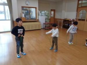 ランチルームで、縄跳びの練習をしました。