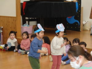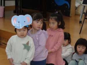 その後、催しになり、今月はうさぎ組の出し物当番で、みんなで「一人のぞうさん」の手遊びに合わせて一人ずつくっついていく
