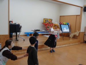 遊びを披露しました。歌に合わせて楽しくくっついていました。