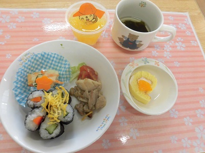 細巻きで花を作りました。のりが食べにくい子供もいたので