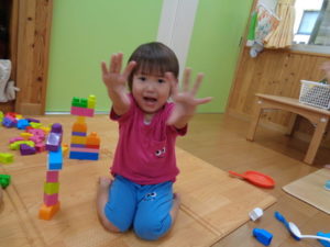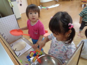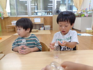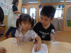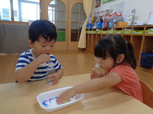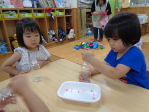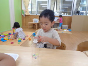 今日は保育室で、様々なビーズや豆を指でつまんでボトルの口から入れるのですが、周りにこぼれてなかなか入らず苦戦している子もいました。