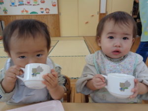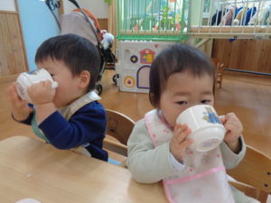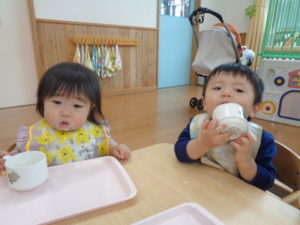 朝のおやつで、自分でコップを持って 上手に牛乳🥛やお茶を飲む子が増え、成長を感じています。