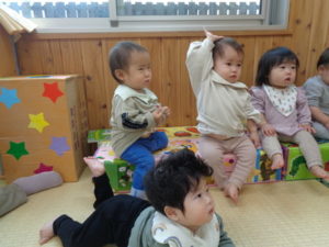 その後のお集まりでは、音楽に合わせて体を揺らしたり、両手を挙げてお返事をしてくれたりと笑顔も増えて癒されます。