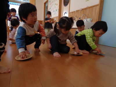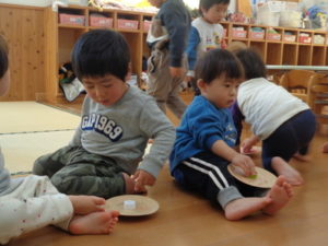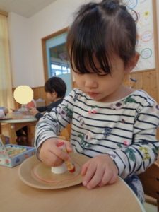 今日は、お正月遊びという事で、みんなでコマを作って遊びました。