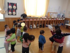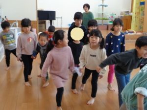 きりん組🦒・りす組🐿、それぞれ朝のお集りが終わった後、合同リトミックを行いました。