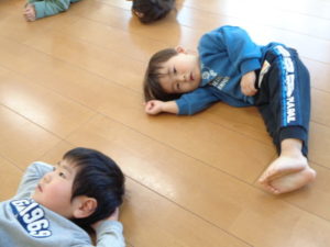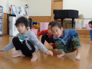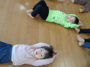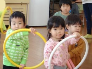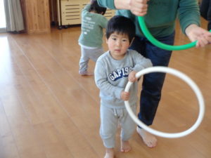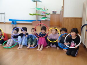 他にも、カエル🐸、アヒル🦆、ツバメ、トンボ、どんぐり、ウサギ🐇、そして最後にフラフープを使って、車になりきって前・後ろ・ストップをしました。