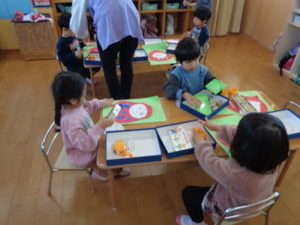 次に、金曜日にうさぎ組🐇さんと「フルーツバスケット」をするので、リンゴ🍎・イチゴ🍓などを塗り絵をしてくれました。