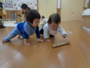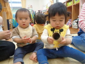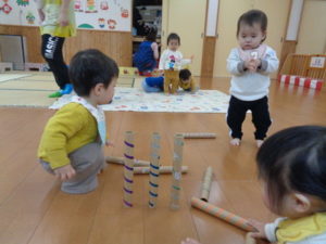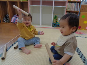 いつも通りにお集まりをして、ラップの芯で遊びました。