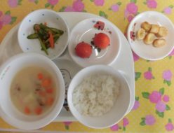 今日は、晴れ☀旬の野菜アスパラを使った胡麻和え皆残さず食べてくれました♬明日のお誕生会の給食お楽しみ‼~♪献立♪~・シチュー・アスパラの胡麻和え・果物~♪おやつ♪~・牛乳・おふのラスク&nbs...