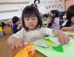 今日は、チューリップ🌷の製作をしました。お道具箱から、クレヨン・糊などの出し方を教えました。クレヨンの箱からクレヨンを出して、チューリップの花に色を付けました。葉っぱ🍃は、折り紙をビリビリ~として糊付けします。
