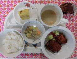 今日は、昨日より少しひんやりしましたね。給食は、すり身のコーン揚げでした。ごぼうや玉ねぎ、人参などを入れました!副菜は、さつまいもをいただいたのでさつまいもサラダにしましたよ❣❣おやつは、リクエストメニューのココア蒸しパンでした。