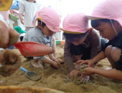 今日持って帰る、荷物整理をしました。名前があっているか、1つずつ確認して、自分達で袋に入れる事が出来ました。整理が終わった後は、素足👣で戸外遊びを楽しみました🎶汚れる事を気にせず、泥まみれになりながら遊ぶ子どももいれば、汚れない様に考えて遊ぶ子どももいました。