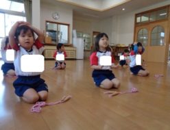 体操教室では、縄跳びをしています。縄から落ちない様にバランスを取りながら歩いたり、縄を踏まない様に両足跳びをしたり・・・。最後は、前・後ろ跳びをしました。
