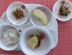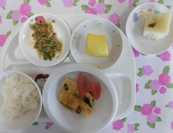 明日、明後日は、とても寒くなりそうですね。給食は、擬製豆腐でした。人参やほうれん草、椎茸などを入れました!椎茸の出汁で餡を作ってかけて提供しました!おやつは、蒸しパンでした。