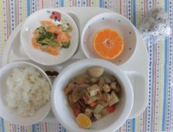 今朝も冷え込みが厳しく、寒かったですね。そんな中でも子ども達は元気に活動していました。私たちも見習いたいですね。今日の給食は、麻婆丼でした。玉ねぎ、人参の香味野菜をたっぷり使って、保育園で作ったお味噌を入れて仕上げました。