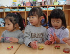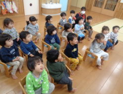 りす組🐿は、椅子に座ってお集りが出来るようになりました😊♪ゆきのペンキ屋さん を歌ってから、名前を呼ぶと手を挙げて「ハイ✋」と元気よく返事をしてくれました。次に、節分の豆入れの製作をしました。豆まきで使う豆入れの、赤と青のどちらが良いか?を選ばせました。