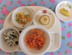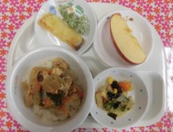 今日は、曇りがちなお天気でしたが暖かかったですね!給食は、親子丼でした。多かったかなと思いましたがたくさん食べてくれました♬おやつは、芋天でした。