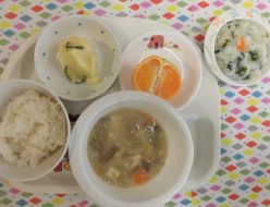 今朝も寒かったですね。給食は、呉汁でした。大根や人参、ごぼうなど他にもいろいろな野菜を入れて、大豆を入れて味付けしましたよ!おやつは、七草粥でした。