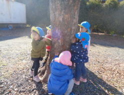 天気が良かったので、近くの公民館へお散歩に行きました☀お友達と上手に手を繋ぎ、列になって歩くうさぎ組🐇さん。公民館へ到着すると、大きな木の幹に集まり、「だ~るまさんがこ~ろんだ❣❣」と言って、すぐ遊び始めました。
